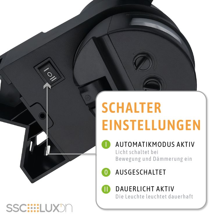 Der integrierte Sensor aktiviert das Licht nur bei Bedarf und lässt sich flexibel ausrichten. Die Unterseite der Leuchte bietet Zugriff auf die wichtigsten Einstellungen, sodass die Aktivierung bei Dunkelheit und Bewegungen präzise angepasst werden kann. Zusätzlich befindet sich dort ein Schalter mit drei Funktionen: II = Dauerlicht, 0 = Aus, I = Automatikbetrieb mit Dämmerungs- und Bewegungsmelder. Dadurch lässt sich die Leuchte schnell und situativ steuern.