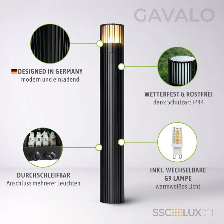 Wie setzen Sie Außenbeleuchtung unkompliziert und dauerhaft um? Die GAVALO Pollerleuchte ist für den Anschluss an 230 V konzipiert und für den dauerhaften Einsatz im Außenbereich ausgelegt. Robuste Materialien und die Schutzart IP44 sorgen für zuverlässige Funktion bei Wind und Wetter. Durch das bereits enthaltene, dimmbare Leuchtmittel lässt sich die Leuchte direkt in Betrieb nehmen und flexibel in bestehende Lichtkonzepte integrieren – für eine Außenbeleuchtung, die sich Ihrem Alltag anpasst.