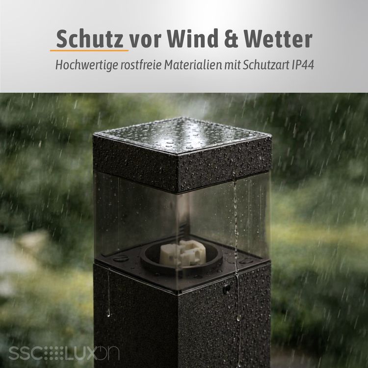 Leuchten der Schutzklasse IP44 dürfen innen und außen verwendet werden. Schutz gegen allseitiges Spritzwasser – Montage zum Beispiel unter dem Vordach möglich – Keine Montage über Dusche, Badewanne.