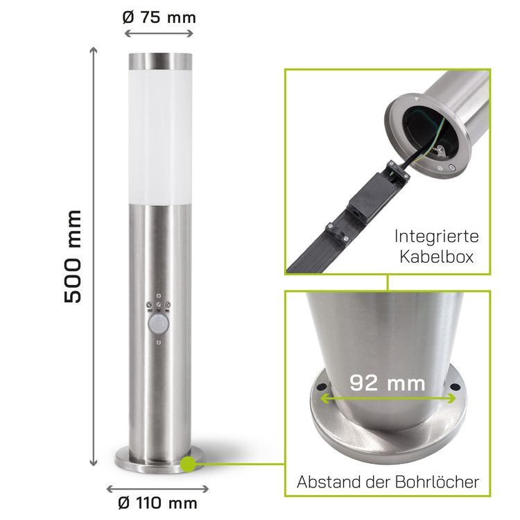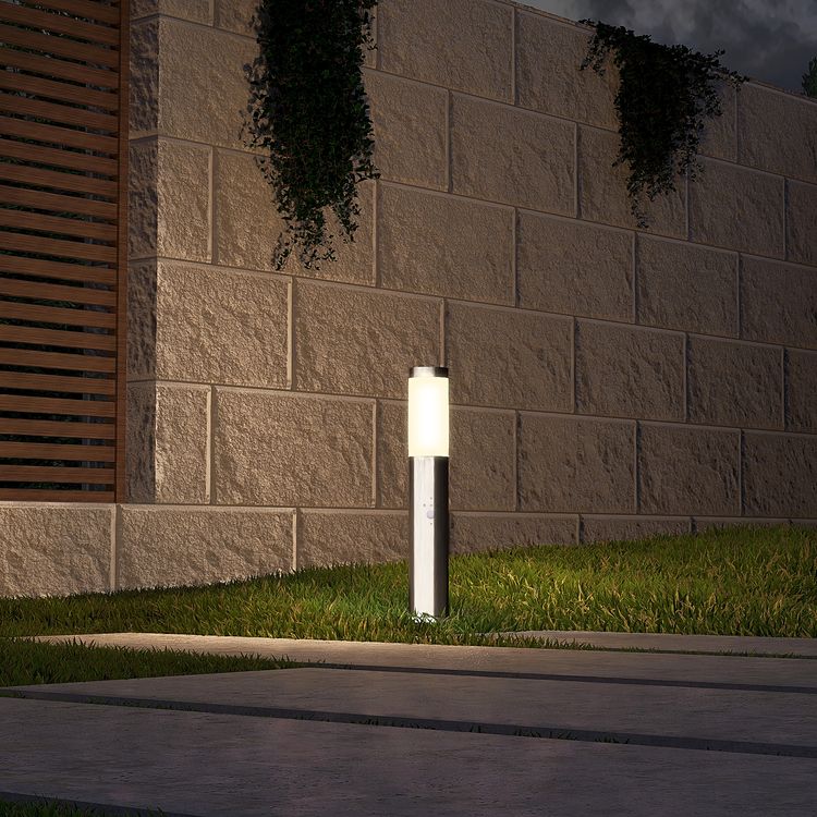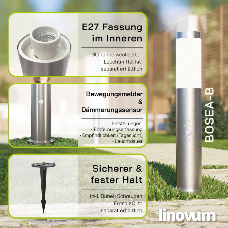- Die BOSEA-B Pollerleuchte ist mit einem integrierten Bewegungsmelder und Dämmerungssensor ausgestattet