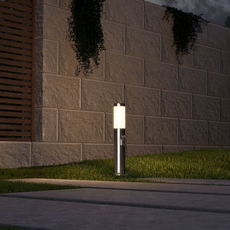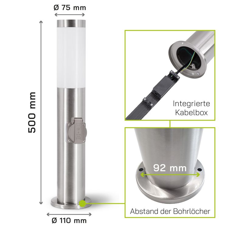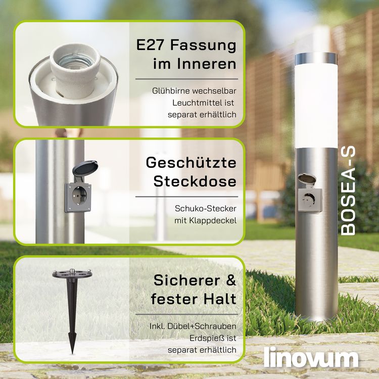 - Die BOSEA-S Pollerleuchte verfügt über eine integrierte Außensteckdose