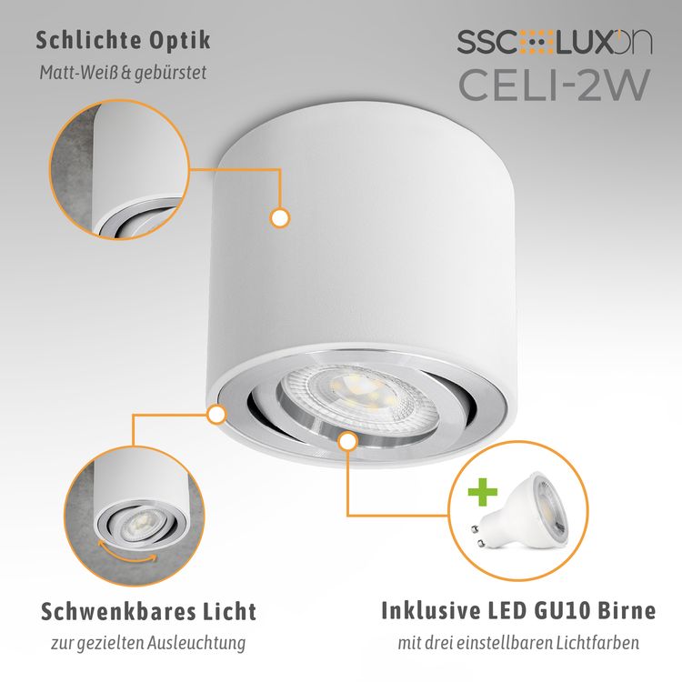 Jede CELI-2W Aufbauspot Lampe wird inklusive eines energieeffizienten GU10 LED-Leuchtmittels mit LumiFLEX Funktion von SSC-LUXon geliefert. Über einen integrierten Schalter am Leuchtmittel wählen Sie bequem zwischen warmweiß, neutralweiß und tageslichtweiß – passend für unterschiedliche Wohnsituationen. Zusätzlich ist das Leuchtmittel dimmbar, sodass Sie die Helligkeit stufenlos anpassen können. Die SSC-LUXon LEDs überzeugen durch natürliche Farbwiedergabe (CRI), hohe Lichtqualität und lange Lebensdauer. Für die Dimmersteuerung empfehlen wir die Universal-Drehdimmer LUXARA oder Obrius.