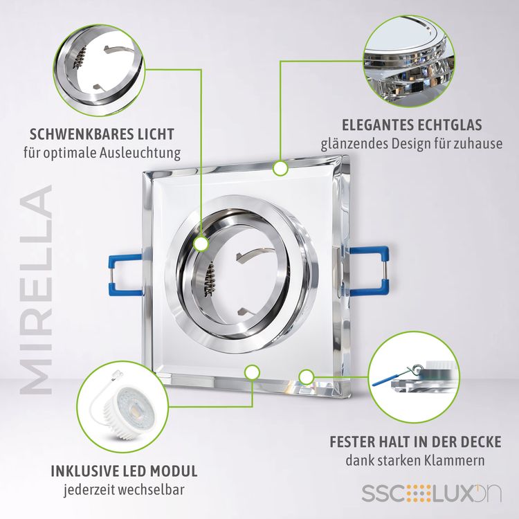 Spiegelndes Echtglas kombiniert mit einer quadratisch, geradlinigen Form. Das ist der flache LED Einbaustrahler aus transparentem Echtglas. In reizvollem Kontrast dazu steht der fein polierte Innenring aus Aluminium, welcher die mitgelieferte LED Lampe im Zentrum einfasst und sich zusätzlich schwenken lässt.
