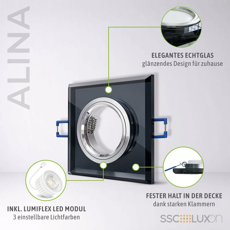 Die Arbeits- und Wohnumgebung geschmackvoll aufwerten, ein Leichtes mit dem quadratischen Einbaustrahler aus Spiegelglas. Setzen Sie mit LED Licht markante Akzente, denn der LED Strahler harmoniert stilsicher mit jedem modernen Einrichtungsstil. Die Einbaudeckenlampe spendet Ihnen angenehmes Licht in Wohnzimmer. Schlafzimmer, Flur oder in anderen Räumlichkeiten.