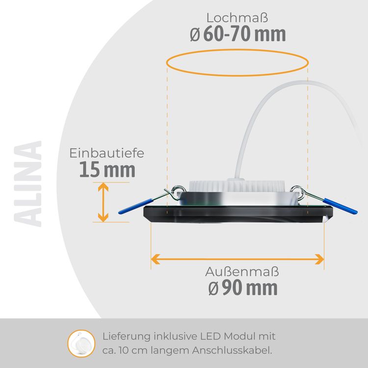 ALINA Einbaustrahler dimmbar eckig schwarz mit LED Lampe mit wählbarer Farbtemperatur warmweiß / neutralweiß / tageslichtweiß 6W