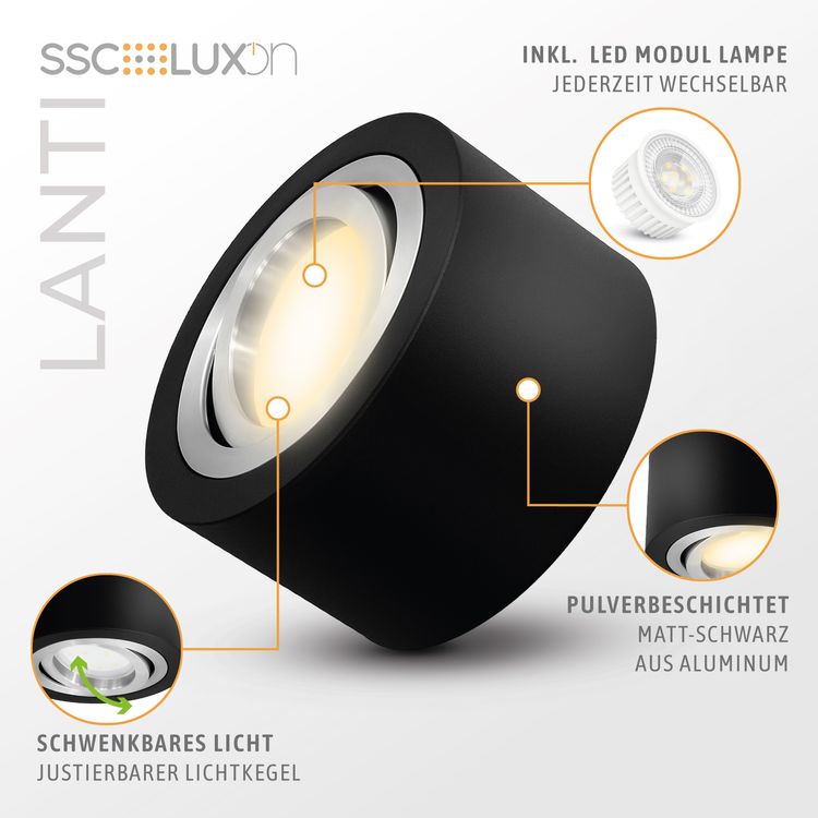Der SSC-LUXon LANTI verleiht Ihrem Zuhause eine moderne und zugleich zeitlose Note. Mit seinem matt-schwarzen Gehäuse und dem silbernen Innenring setzt der Spot stilvolle Akzente an der Decke. Das schwenkbare Design ermöglicht es Ihnen, das Licht individuell auszurichten und so Möbel, Bilder oder bestimmte Bereiche gezielt hervorzuheben. Damit schaffen Sie eine angenehme Atmosphäre, die Funktionalität und Ästhetik perfekt miteinander verbindet.