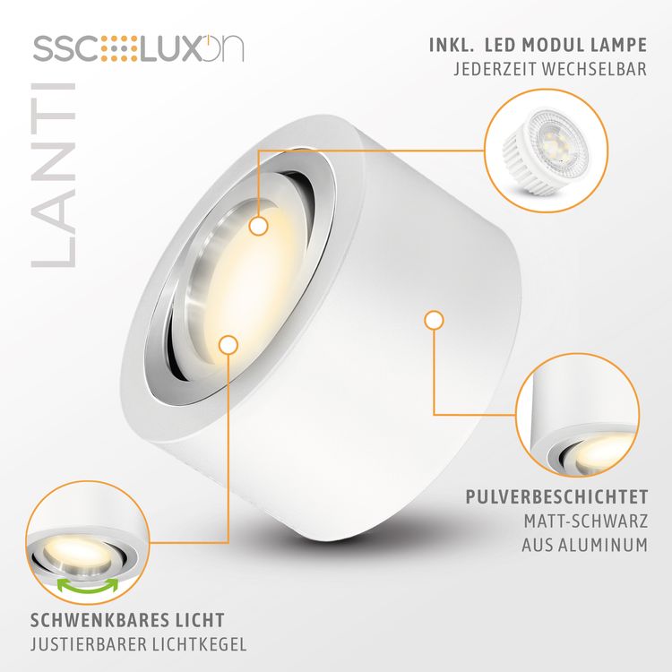 Ob als Deckenstrahler in Wohnzimmer, Küche oder Flur – der LANTI LED Aufbauspot sorgt immer für das passende Licht. Durch den schwenkbaren Leuchtenkopf lassen sich gezielt Akzente setzen und Bereiche optimal ausleuchten. Das macht ihn zu einem echten Allrounder für moderne Innenräume, der Design und Funktion harmonisch vereint.