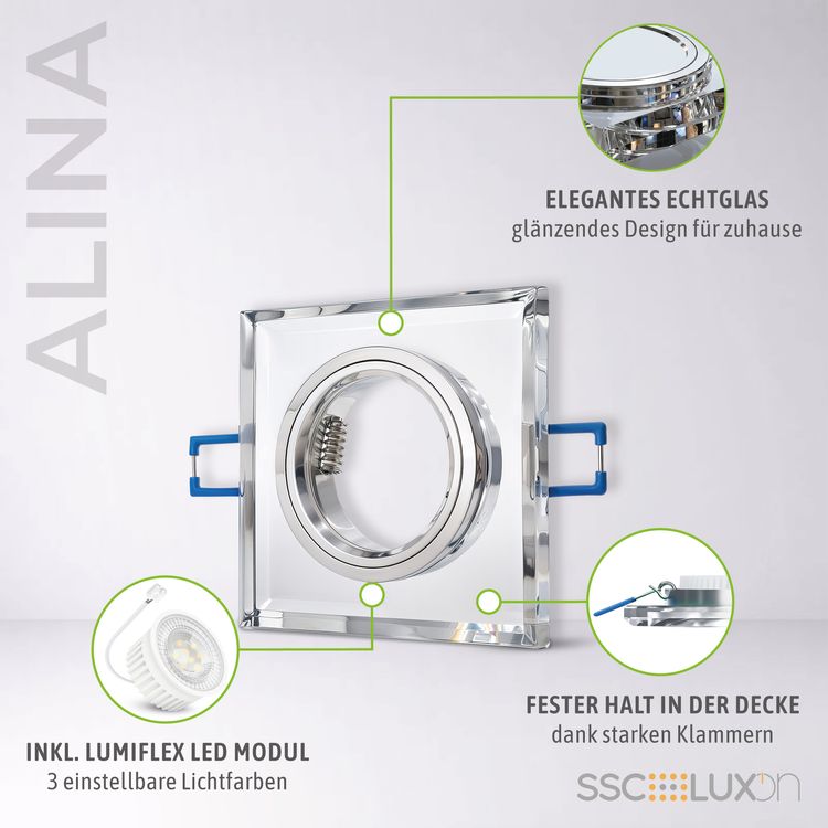 ALINA Flache Glas LED Einbaustrahler quadratisch klar inkl. LumiFLEX LED Modul 230V 4W warmweiß + neutralweiß + tageslicht