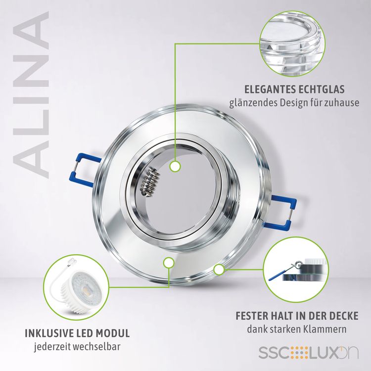 Sie wünschen sich Veränderung und das gewisse Etwas in ihrer Wohn- und Arbeitsumgebung? Ein Leichtes für den klarenen Einbaustrahler aus Glas. Rund und harmonisch fügt er sich stilsicher in jeden modernen Einrichtungsstil. Die Einbau-Leuchte schenkt Ihnen jederzeit angenehmes Licht in bester Qualität. Also ein klares Plus für ihren Wohlfühlfaktor und ideale Voraussetzungen für Büro, Atelier, Praxis und selbstverständlich für Ihr behagliches Zuhause.