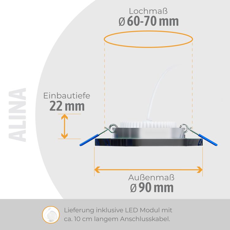 Setzen Sie jetzt neue zeitlose Akzente in Ihrer Wohn- und Arbeitsumgebung. Dafür eignet sich diese Deckeneinbauleuchte ALINA mit spiegelndem Klarglas und runder Form optimal. Gerade in modernen Einrichtungsstilen kommt er harmonisch zur Geltung. Die LED Einbauleuchte spendet Ihnen jederzeit angenehmes Licht. Das sind ideale Bedingungen für Flur, Büro, Praxis oder Wartebereiche aber natürlich auch für Ihr eigenes Zuhause.