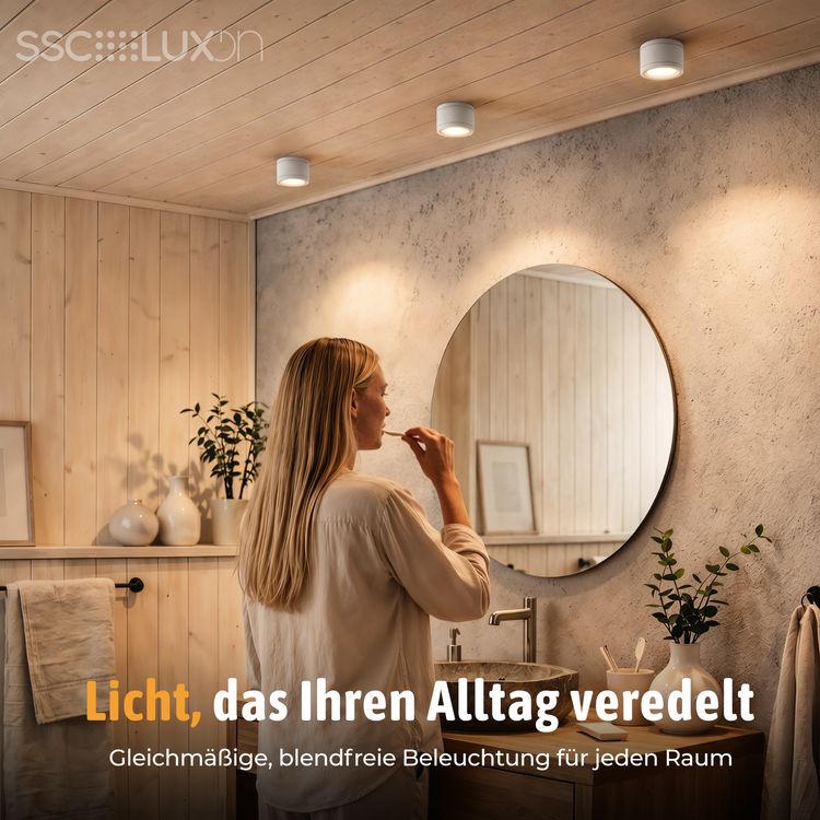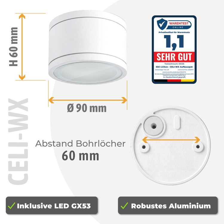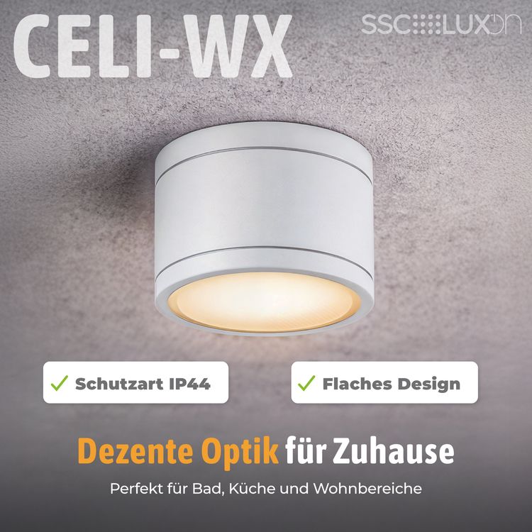 Die optimale Alternative bei wenig Platz oder wenn z.B. Einbauleuchten nicht möglich sind. Der extra flache Aufbauspot CELI-WX mit seinem schlichten, weißen Design und dem mitgelieferten LED GX53 Leuchtmittel ergeben eine perfekte Deckenleuchte für Ihr Badezimmer, Außenbereich aber auch Wohnzimmer oder Flur. Durch die extra große Leuchtfläche des GX53 Leuchtmittels entsteht dabei eine wunderschöne Licht-Atmossphäre. Profitieren Sie von dem besonders breit gestreutem Licht und lassen Sie Ihr Bad in neuem Licht erstrahlen.