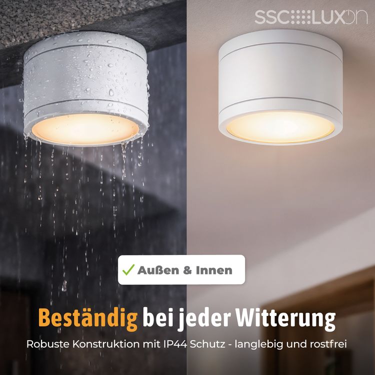 Mit der Schutzart IP44 eignet sich dieser weiße Aufbau LED Strahler optimal für Feuchtraume wie Badezimmer, Keller aber auch für den Außenbereich wie Garten, Balkon oder Hauseingang. Das abgegebene Licht wird von einer milchigen Glasscheibe und zusätzlichen Dichtungsringen geschützt. Somit müssen Sie sich um Spritzwasser keine Sorgen machen. Selbstverständlich kommen nur rostfreie Materialien zum Einsatz. Somit bleibt Ihnen dieser Aufbau Deckenstrahler viele Jahre erhalten.