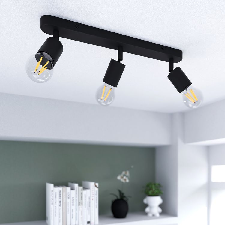 Die schwarze, dreiflammige Deckenleuchte verbindet ein reduziertes Design mit moderner Beleuchtungstechnik und passt ideal in nahezu jeden Raum. Klare Linien und das moderne Schwarz sorgen für eine zeitlose Optik, die sich in klassische, moderne oder vintage-inspirierte Einrichtungsstile einfügt. Jeder Spot ist einzeln schwenk- und drehbar, sodass Sie die Lichtverteilung flexibel an den Raum anpassen können.