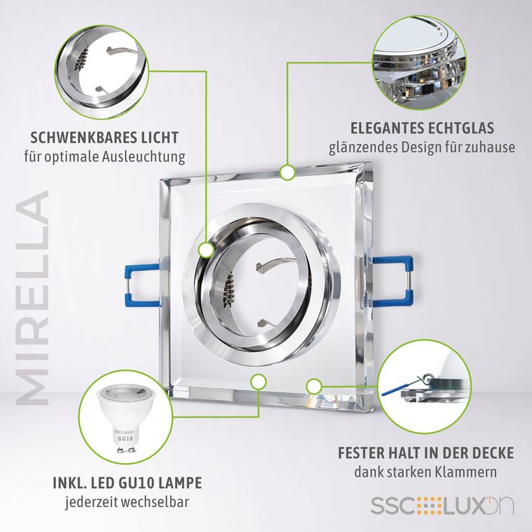 MIRELLA Glas Einbauleuchte eckig & schwenkbar inkl. LED GU10 Leuchtmittel 5W LumiFLEX