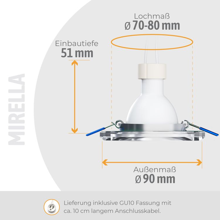 Die Montage der quadratischen Einbaulampe aus Glas funktioniert zügig und unkompliziert. Sie kommt inklusive einer LED Lampe mit integrierter Leitung zum Anschluss an 230 Volt und benötigt deshalb keinen zusätzlichen Trafo. Der Leuchtmittelwechsel kann einfach und schnell vorgenommen werden.