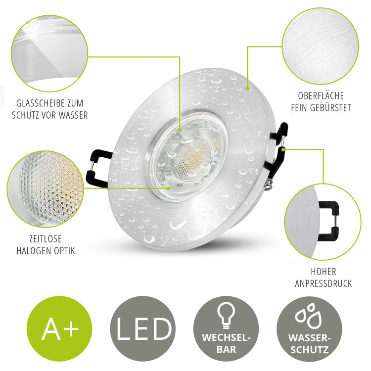 ISASO Bad Einbaustrahler IP65 GU10 6W LumiFLEX Lichtfarbe warm / neutral / kalt 230V gebürstet