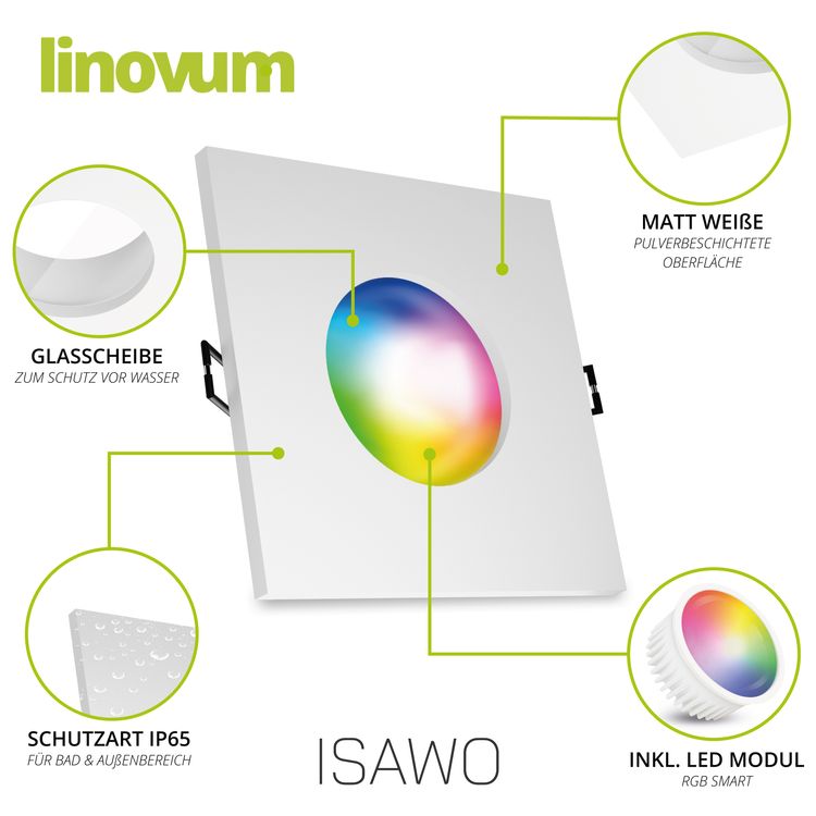 ISAWO Einbau Deckenstrahler IP65 weiß quadratisch mit smart LED Modul 4W RGB CCT