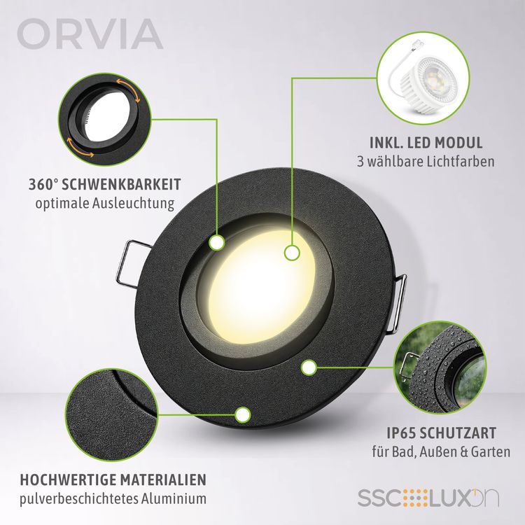ORVIA Einbauspot Vollschwenkbar IP65 schwarz inkl. LumiFLEX Birne 4W 3 Lichtfarben warm neutral kalt