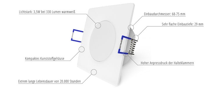 Dank der geringen Einbautiefe eignet sich die Einbauleuchte auch für Deckenräume mit wenig Platz. Der Einbaulochdurchmesser beträgt 68–75 mm, die Außenkantenlänge liegt bei 85 mm. Besonders geeignet ist die Leuchte für Badezimmer und andere Feuchträume bis IP44, aber auch für Spiegelschränke, Kleiderschränke oder Küchenmöbel. Mit einem Abstrahlwinkel von 110° wird der Raum gleichmäßig ausgeleuchtet und dunkle Ecken werden vermieden.