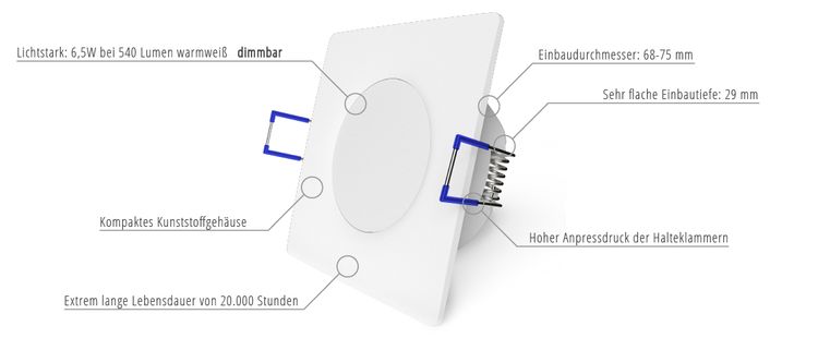 Die moderne LED-Technik überzeugt durch eine extrem lange Lebensdauer und macht den regelmäßigen Leuchtmittelwechsel nahezu überflüssig. Im Vergleich zu herkömmlichen Halogenleuchtmitteln lassen sich bis zu 90 % Energie einsparen. Durch den sehr flachen Aufbau ist keine zusätzliche Fassung erforderlich, die Einbautiefe beträgt nur ca. 29 mm und eignet sich ideal für abgehängte Decken. Der direkte Anschluss an 230 V erfolgt ohne zusätzliche Trafos.