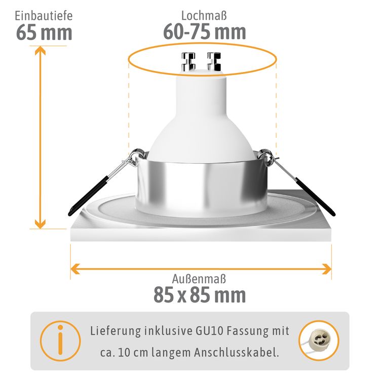 Der Einbaustrahler wird inklusive 2W warmweißem GU10 Leuchtmittel geliefert. Dieses überzeugt durch seine hohe Energieeffizienzklasse A und sorgt für ein angenehmes, wohnliches Lichtbild. Ideal für alle, die Wert auf stromsparende und gleichzeitig zuverlässige Beleuchtung legen.