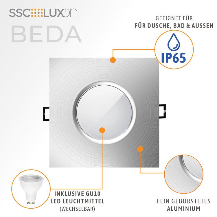 Mit seiner Vielseitigkeit und solider Verarbeitung überzeugt der Deckeneinbaustrahler BEDA auf ganzer Linie. Das abgegebene Licht wird von einer Glasscheibe und zusätzlichen Dichtungsringen geschützt. Somit müssen Sie sich um Spritzwasser oder Wasserdampf keine Sorgen machen. Selbstverständlich kommen nur rostfreie Materialien zum Einsatz. Somit bleibt Ihnen dieser Badeinbaustrahler viele Jahre erhalten.