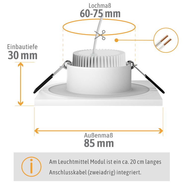 Der Einbaustrahler wird inklusive 2W warmweißem GU10 Leuchtmittel geliefert. Dieses überzeugt durch seine hohe Energieeffizienzklasse A und sorgt für ein angenehmes, wohnliches Lichtbild. Ideal für alle, die Wert auf stromsparende und gleichzeitig zuverlässige Beleuchtung legen.