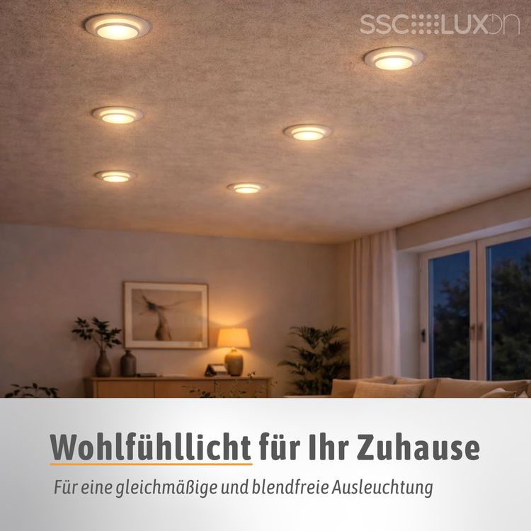 Neben dem gerichteten Licht nach unten erzeugt der LAGO Einbauspot zusätzlich ein seitliches, indirektes Licht. Dieses sorgt für eine angenehme Lichtwirkung und setzt die Decke dezent in Szene. Es entsteht ein gleichmäßiger Lichtring, der den Raum optisch aufwertet und eine ruhige, wohnliche Atmosphäre schafft. In Kombination mit der dimmbaren Funktion lässt sich die Lichtintensität flexibel anpassen – von heller Ausleuchtung bis hin zu sanftem Ambientelicht.