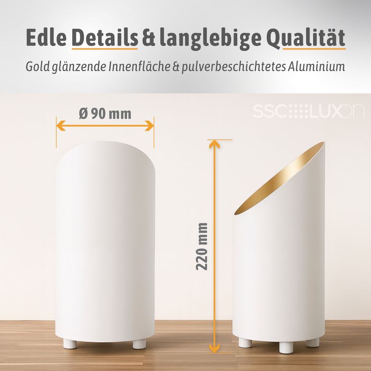 Mit ihrer schlanken, zylindrischen Form und der edlen weiß-gold Oberfläche fügt sich die AUREVA harmonisch in unterschiedliche Wohnstile ein. Ob als dekorative Sideboardlampe, kleine Stehleuchte neben dem Sofa oder als stimmungsvoller Akzent im Schlafzimmer – sie bringt flexible Beleuchtung in jeden Raum. Durch die Möglichkeit, die Lichtintensität anzupassen, eignet sich die Leuchte sowohl für gemütliche Abende als auch für Situationen, in denen Sie mehr Helligkeit benötigen.