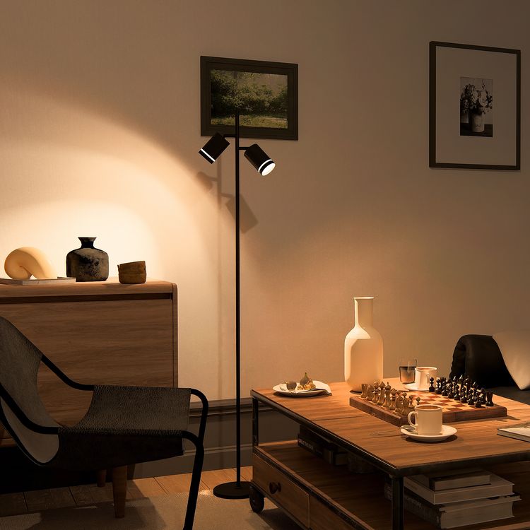- Design-Stehleuchte mit zwei Leuchtenköpfen
