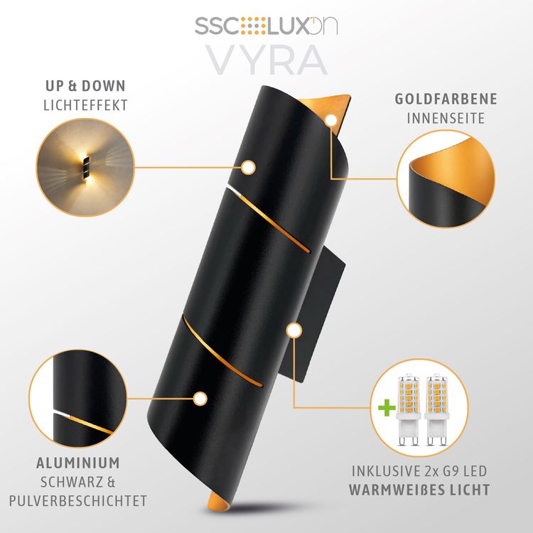 Gefertigt aus hochwertigem, pulverbeschichtetem Aluminium, überzeugt die VYRA LINE durch edle Materialien und langlebige Qualität. Der Kontrast zwischen der schwarzen Außenfläche und der goldfarbenen Innenbeschichtung betont die elegante Lichtwirkung der Up-&-Down-Ausstrahlung. Die Leuchte wird inklusive G9 LED-Leuchtmittel dimmbar 3W warmweiß geliefert – energiesparend, langlebig und sofort einsatzbereit. So genießen Sie stimmungsvolles Licht mit geringem Verbrauch und hochwertiger Verarbeitung in einem eleganten Design.