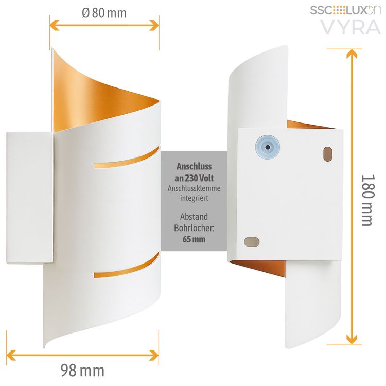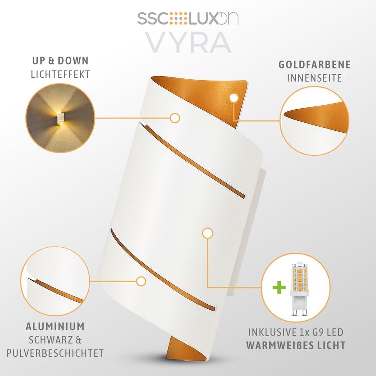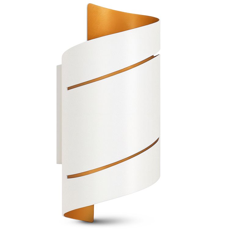 Die VYRA Wandlampe in Weiß-Gold vereint modernes Design mit einer wohnlichen Lichtwirkung. Das Zusammenspiel aus weißer Oberfläche und goldfarbener Innenfläche sorgt für eine warme, elegante Ausstrahlung und schafft eine Atmosphäre zum Wohlfühlen. Als stilvolle Wandbeleuchtung im Flur, Schlafzimmer oder Wohnzimmer setzt sie feine Akzente und unterstreicht den Charakter des Raumes. Das harmonische Lichtkonzept macht sie zum idealen Begleiter für eine dezente und hochwertige Raumgestaltung.