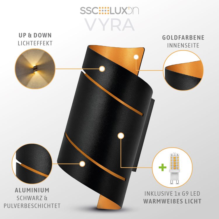 Die VYRA Wandlampe in Schwarz-Gold bringt elegantes Design und stimmungsvolle Lichtwirkung in Ihr Zuhause. Die Kombination aus mattschwarzer Oberfläche und goldener Innenfläche erzeugt einen edlen Kontrast, der jedem Raum eine warme und harmonische Atmosphäre verleiht. Ob im Flur, Wohnzimmer oder Schlafzimmer – die Leuchte schafft eine angenehme Lichtverteilung und setzt dekorative Akzente, die Ihre Einrichtung stilvoll ergänzen.