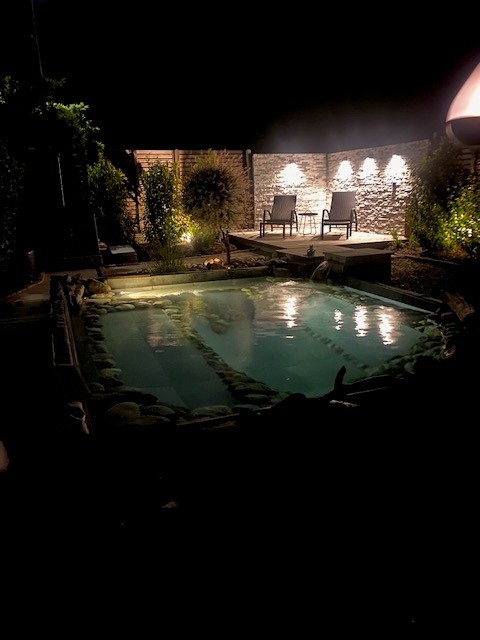 Der stimmungsvoll beleuchtete Garten kommt durch das Licht besonders in den Abendstunden zur Geltung. Rund um den Naturpool entsteht so ein beeindruckendes Spiel aus Licht und Spiegelungen.