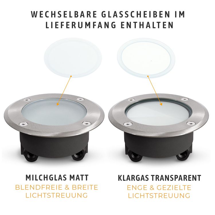 Ein weiterer Pluspunkt den Sie bei dieser Bodeneinbauleuchte erhalten: die Milchglasscheibe sorgt zusätzlich für weiches und blendfreies Licht. Das sorgt außerdem auch noch dafür, dass das LED Leuchtmittel im ausgeschalteten Zustand nicht direkt sichtbar ist.