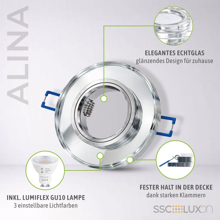ALINA LED Einbaustrahler Echtglas klar 6W LED GU10 LumiFLEX dimmbar Deckenspot Spot