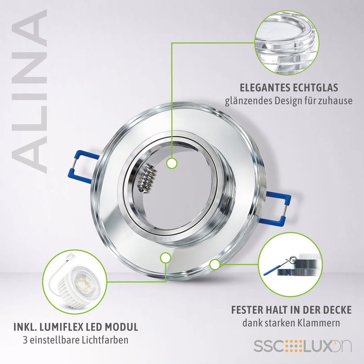 Setzen Sie jetzt neue geschmackvolle Akzente in Ihrer Wohn- und Arbeitsumgebung. Dafür eignet sich dieser Glas-Deckenspot ALINA mit spiegelndem Klarglas und runder Form optimal. Gerade in modernen Einrichtungsstilen kommt er rundum harmonisch zur Geltung. Die Einbauleuchte spendet Ihnen jederzeit angenehmes Licht. Das sind ideale Bedingungen für Flur, Büro, Praxis und natürlich für den Wohlfühlfaktor in Ihrem behaglichen Zuhause.