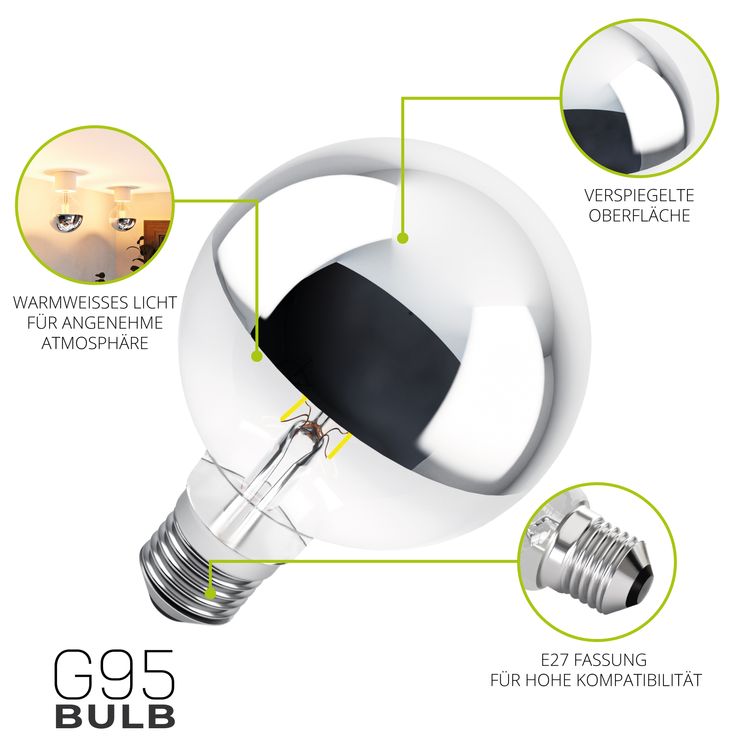 Diese LED-Birne im XL-Globe-Format G95 verbindet dekoratives Vintage-Design mit moderner Lichttechnik. Der verspiegelte Kopf sorgt für eine blendfreie Beleuchtung und lenkt das Licht gezielt nach unten – ideal für Hängeleuchten, zum Beispiel über dem Esstisch. Die extra große Bauform macht das Leuchtmittel zu einem stilvollen Blickfang in Wohnräumen und im Gastronomiebereich.