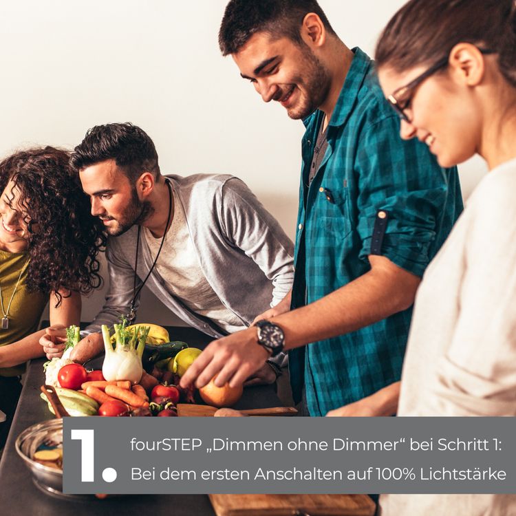 Dank der innovativen fourSTEP-Funktion regulieren Sie die Helligkeit ganz einfach über Ihren vorhandenen Lichtschalter. Durch mehrmaliges Ein- und Ausschalten wechseln Sie zwischen 100 %, 50 %, 20 % und Aus – ganz ohne zusätzlichen Dimmer oder aufwendige Installation. So passen Sie die Lichtstimmung jederzeit flexibel an: helles Arbeitslicht, sanfte Abendbeleuchtung oder dezentes Orientierungslicht in nur einem Leuchtmittel.