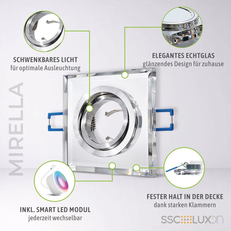 Das Design der flachen Einbaulampe MIRELLA überzeugt durch spiegelndes Glas, welches für eine außergewöhnliche Optik an der Zimmerdecke sorgt. Hinzu kommt die geringe Einbautiefe von nur 27 mm und die integrierte Schwenk-Funktion. So lässt sich das Licht zusätzlich ausrichten und auf gezielte Stellen richten.