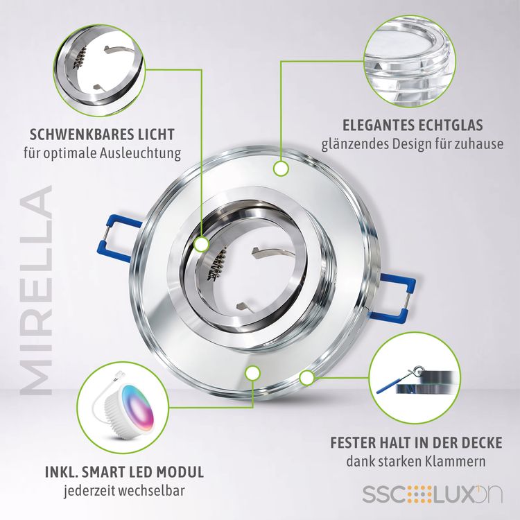 MIRELLA Glas Einbauleuchte flach, rund & schwenkbar inkl. WLAN RGB LED Modul 4W dimmbar