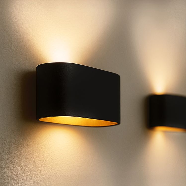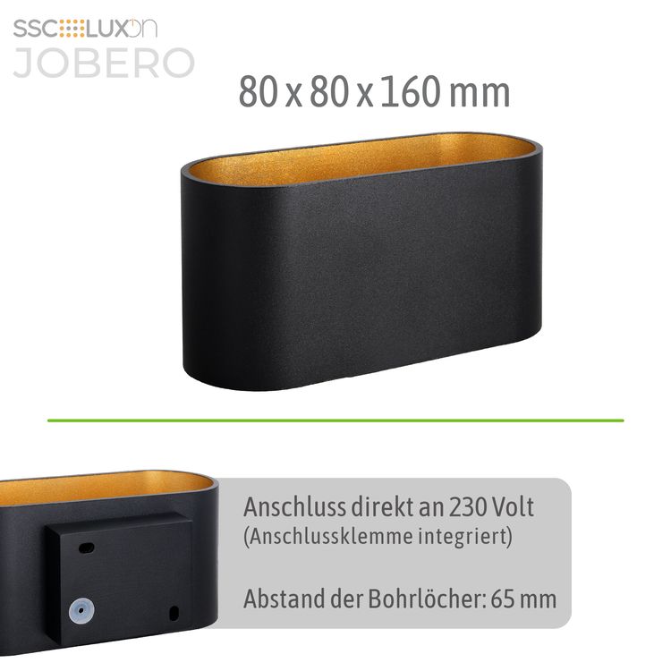 Das elegante Aussehen der ovalen Wandleuchte JOBERO stellt die zeitlose Kombination von Schwarz und Gold in den Mittelpunkt. Das schwarze Gehäuse verleiht der Treppenleuchte für den Innenbereich ein modernes Aussehen, der goldene Lampenschirm im Inneren sorgt für das gewisse Etwas. Die harmonische Kombination des Wandlichts schwarz mit dem goldenen Akzent verleiht jedem Raum eine besondere Atmosphäre.